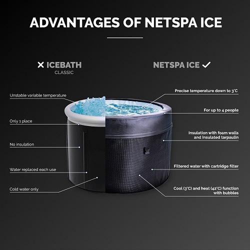 Esqueça o desperdício de gelo e a constante renovação de água. Com o Netspa Icebath, pode manter e filtrar água gelada até 3°C a baixo custo, eliminando a necessidade de cubos de gelo. Ideal para quem procura praticidade e economia em sessões de banhos frios.